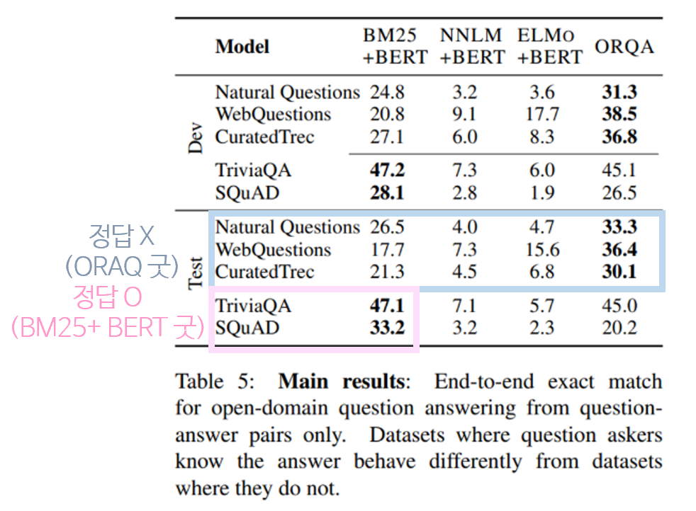 - ORQA๋ ์ง์ง ์ ๋ณด๋ฅผ ์ฐพ๊ณ ์ ํ๋ datasets(Natural Questions, WebQuestions, CuratedTrec)์์ BM25๋ฅผ ๋ฅ๊ฐํ๋ค.