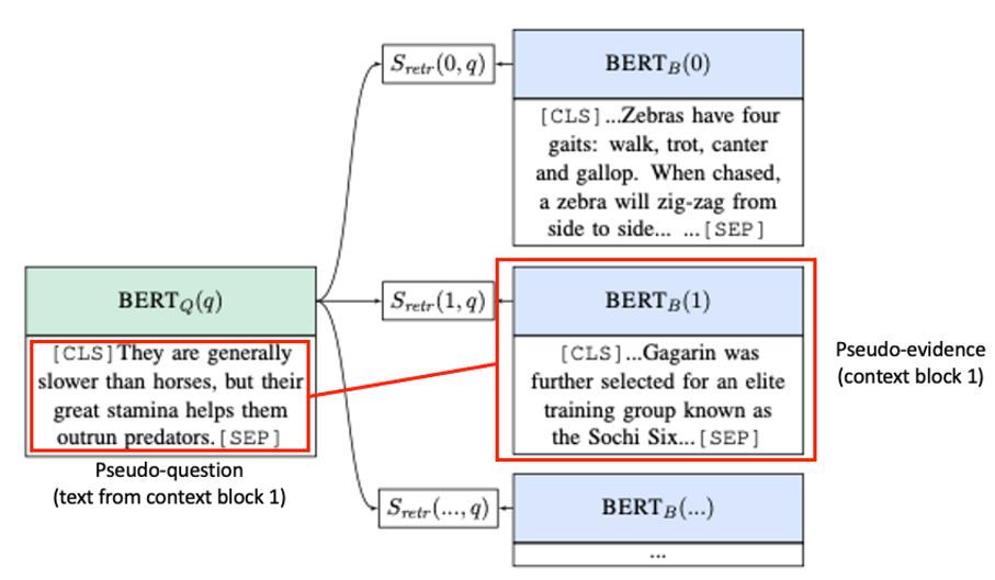์ ๊ทธ๋ฆผ์์ 1๋ฒ index์ context์์ ๊ฐ์ ธ์จ ํ๋์ ๋ฌธ์ฅ์ด pseudo-question์ ์ญํ ์ ํ๋ค. ๊ทธ๋ฆฌ๊ณ ๊ฐ์ ธ์จ ๋งฅ๋ฝ์ด pseudo-evidence๊ฐ ๋๋ค. ์ด๋ฅผ ์์ผ๋ก ๋ค์๊ณผ ๊ฐ์ด ํํํ ์ ์๋ค.