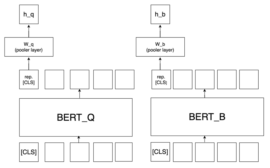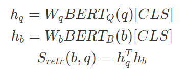 q: question / b: evidence block / W: BERT์ representation vector๋ฅผ 128 dimensional vector๋ก ๋ฐ๊ฟ์ฃผ๋ ํ๋ ฌ
