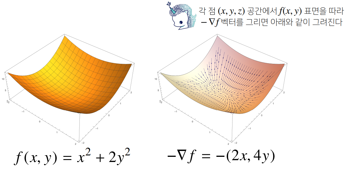 - -∇f는 ∇(-f)와 같고 이는 각 점에서 가장 빨리 감소하게 되는 방향과 같음