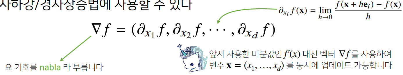 - 각 변수 별로 편미분을 계산한 그레디언트(gradient) 벡터를 이용해 경사하강/상승법에 사용할 수 있음