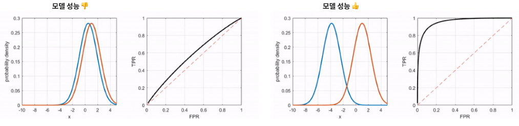 ROC 커브가 좌상단에 붙어있을 수록(FPR은 낮게, TPR은 높게) 더 좋은 이진 분류 모델이다.