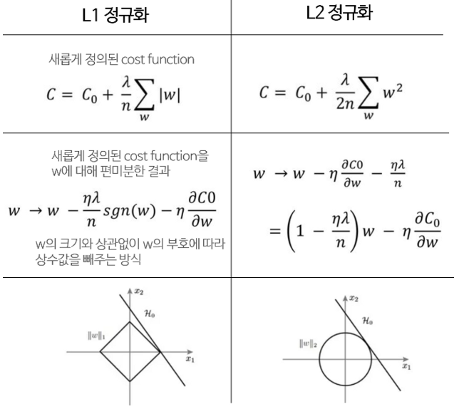 (모델을 학습시킨다는건 결국 모델의 Weight matrix를 좋은 방향으로 업데이트해나가는 것이다. 그런데 이 Weight 중 일부가 학습과정 중 과도하게 커져버린다면, 몇몇개의 인풋에 극단적으로 의존하는 상황이 벌어지고, 이 경우 모델의 일반화 성능은 감소할 것이다. 이때 L1, L2 정규화는 특정 Weight가 과도하게 커지지 않게끔 락(Lock)을 걸어주는 역할을 한다)
