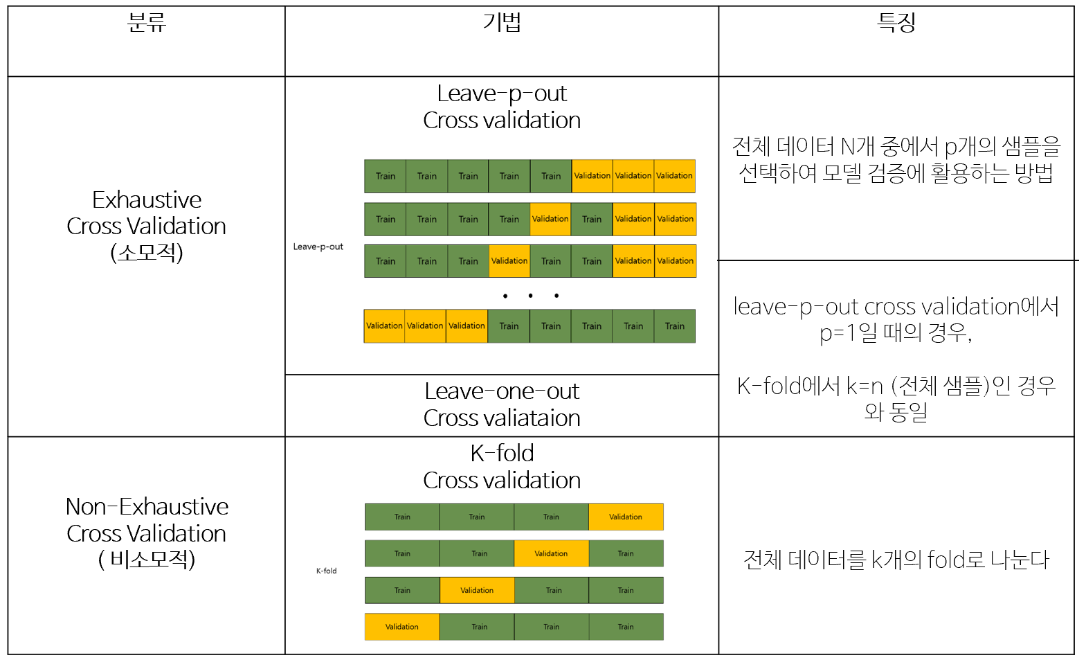 + 교차 검증의 일반적인 방법으로는 k-fold가 있는데 전체 데이터셋을 k개로 나누어 fold 한 개를 validation data로, 나머지 k-1개를 train data로 분할하는 과정을 반복함으로써 train 및 validation data를 교차 변경하는 방법이다.