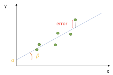 단순선형회귀에서 가장 중요한 것은 이러한 에러를 최소화할 수 있는 a와 b 파라미터 값을 찾는 것이다. 식을 fitting하는 과정을 Ordinary Least Squared error (OLS)라고 한다.