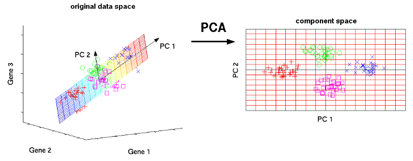 PCA는 대표적인 차원 축소에 쓰이는 기법으로, 높은 차원의 데이터들을 분석하여 그 중에서 핵심이 되는 차원을 뽑아내서 차원을 낮춘다. 예를 들어 (1, 2, 1), (3, 6, 0), (2, 4, 5), (4, 8, 3)이라는 4개의 3차원 데이터가 있다고 가정할 때, 첫 번째와 두 번째 요소는 서로 관계가 있다. 첫 번째 요소의 2를 곱하면 두 번째 요소이다. 따라서 실제로 두 요소 중에서 하나만을 기술해도 나머지 하나는 알 수 있고, 위 데이터 중 겹치는 차원 하나를 제거해서 (1, 1), (3, 0), (2, 5), (4, 3) 과 같이 쓸 수 있다.