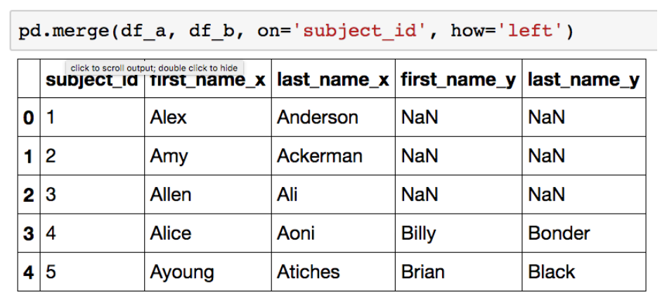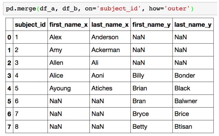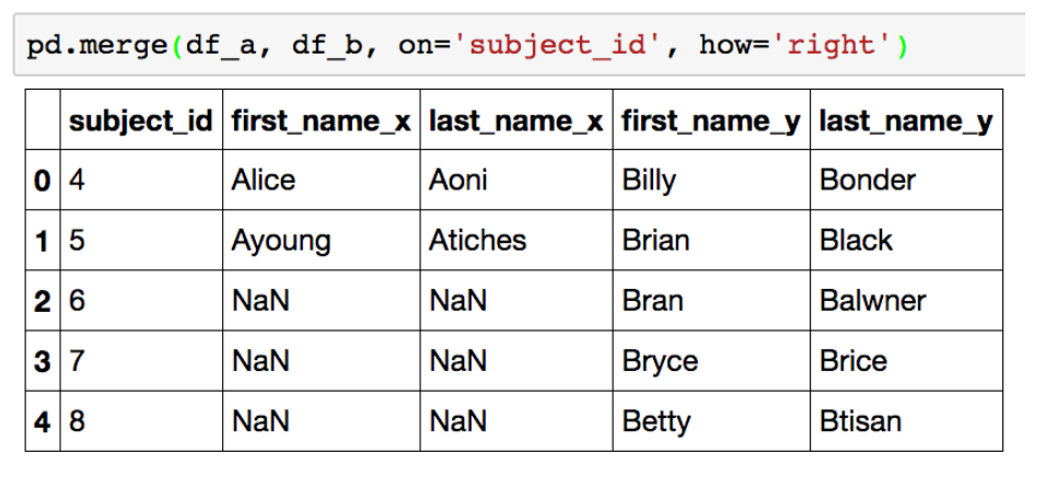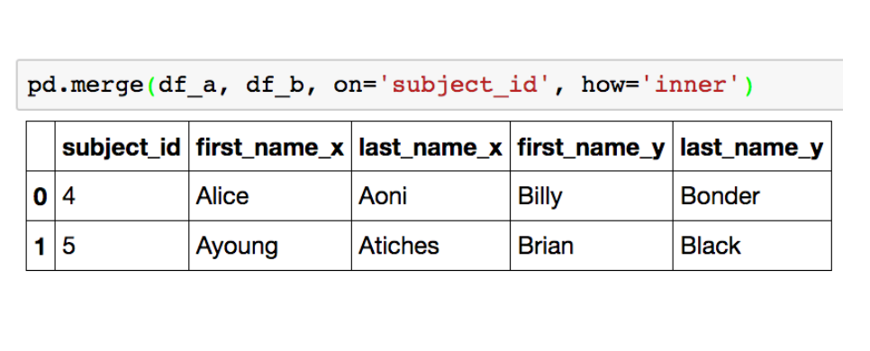 pd.merge(df_a, df_b, left_on = 'subject_id', right_on 'subject_id')